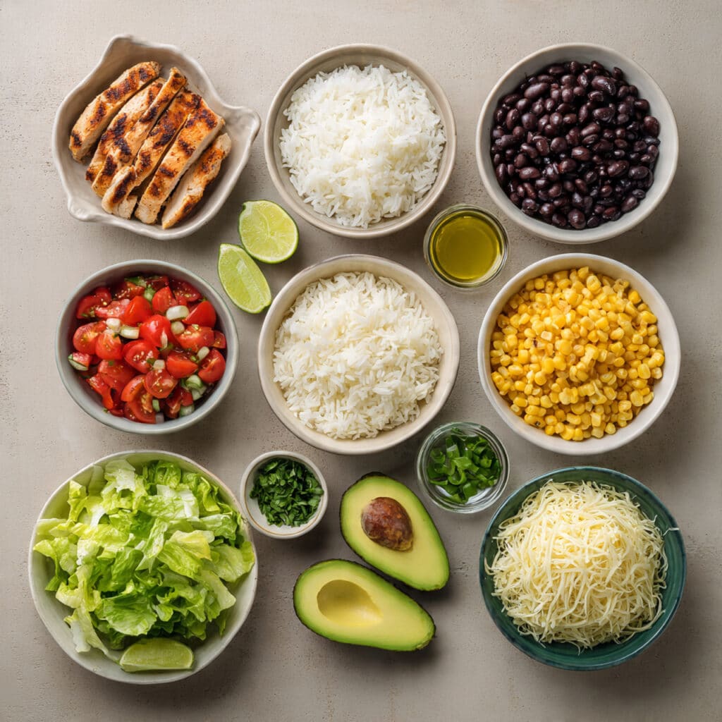 - Assemble the Dish: In a large bowl, add rice first, then arrange chicken, beans, corn, tomatoes, lettuce, and avocado in sections.
