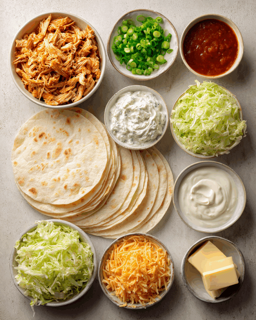 - Flour Tortillas: 4 large – The wrap vessel that gets golden and crisp.