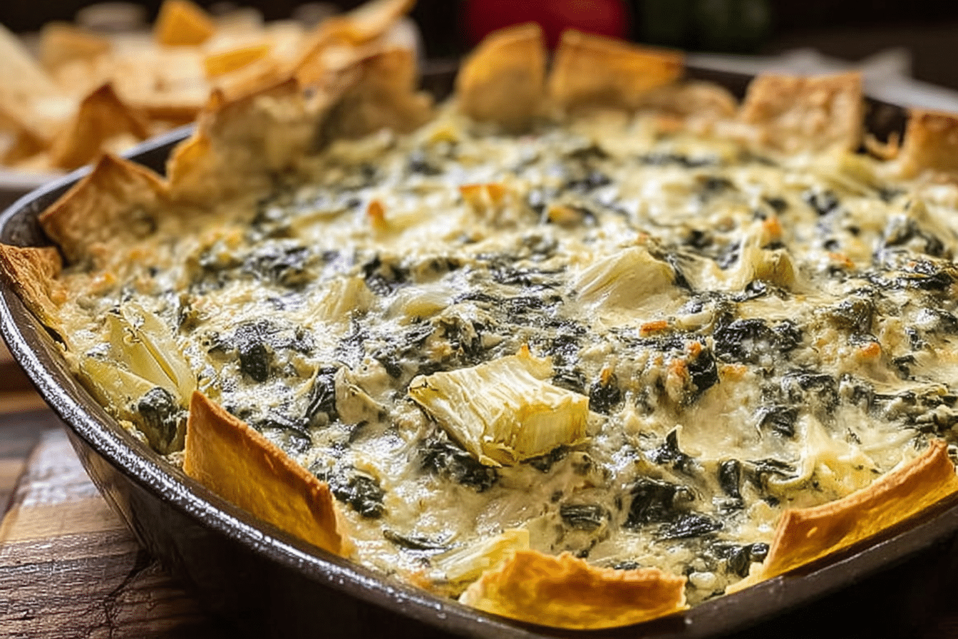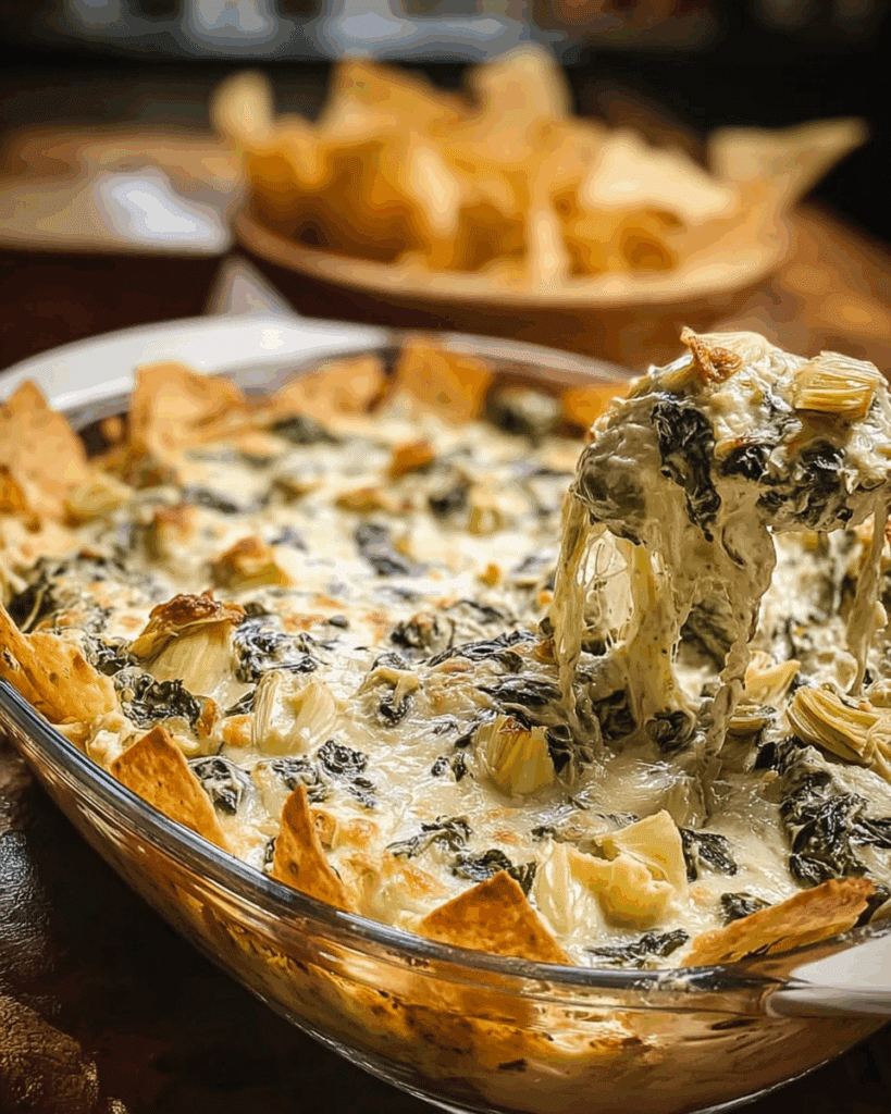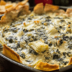 A warm, cheesy, irresistible spinach and artichoke dip baked until bubbly and golden, perfect for parties, game days, or cozy gatherings.