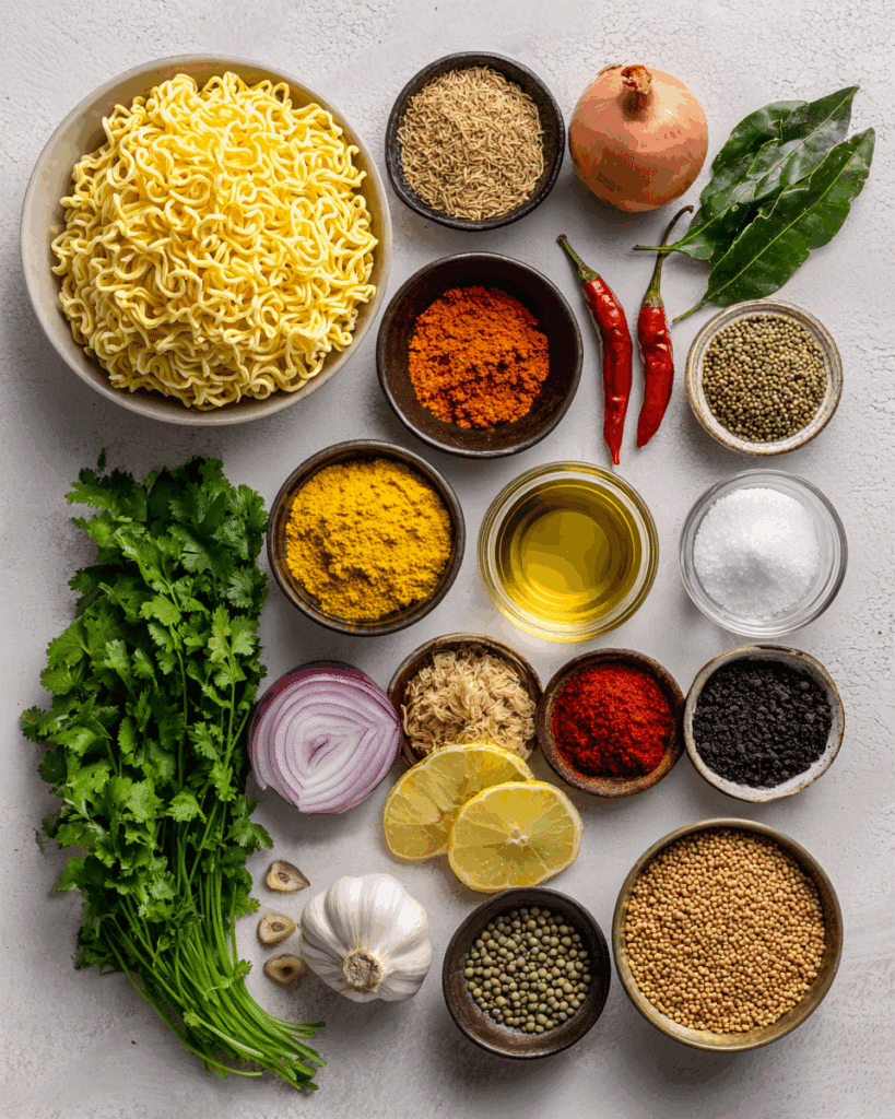 - Instant Noodles: 2 packets (without spice mix), cooked al dente—these form the base and absorb the tadka beautifully.