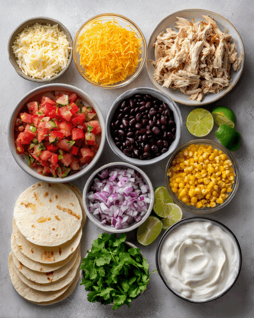 - In a large bowl, mix shredded chicken, black beans, corn, tomatoes, bell pepper, red onion, taco seasoning, and half the cheddar cheese.