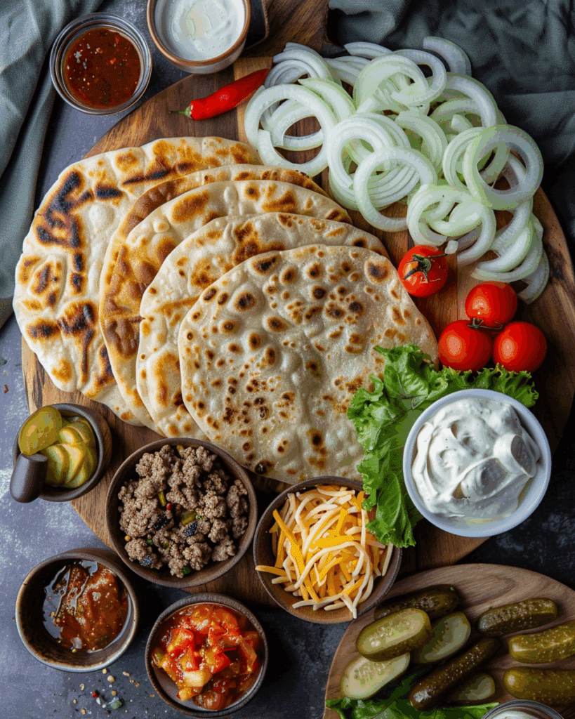 - Assemble the Dish: Place beef balls on the hot skillet, smash with a spatula, and top each with cheese once seared. Fry parathas in butter until golden.