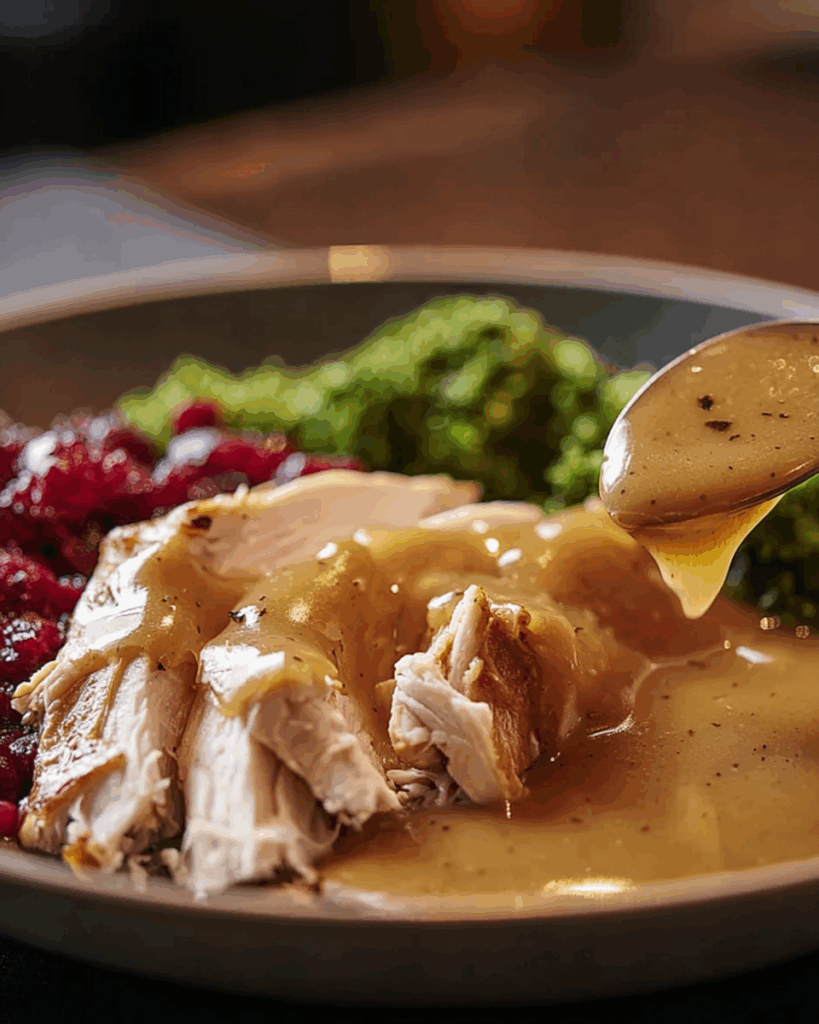 Silky, savory turkey gravy made from pan drippings, butter, and stock, thickened to a velvety finish. Perfect for Thanksgiving, holiday meals, and everyday comfort dishes.